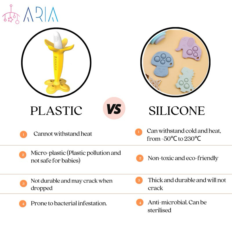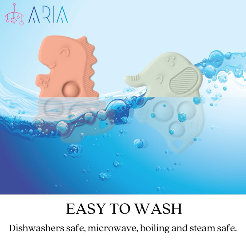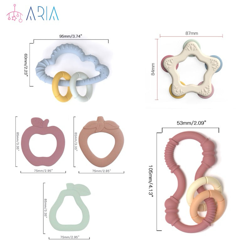 EASY TO HOLD TIGHT: There is a stem inside the hollow body for the little hand of baby to grasp easily or it has pop pad design to help with fine motor skills and coordination. The teethers are made of colourful and vibrant colours to attract infants to use their hands to bring the teether to the mouth. Silicone helps relieve teething discomfort while baby sucking the nipple part.